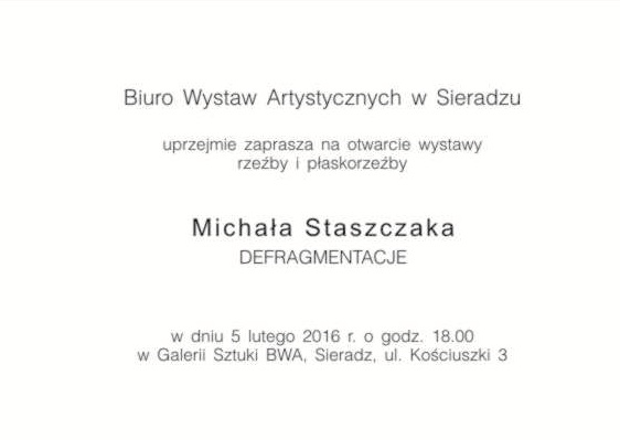 Biuro Wystwa Artystycznych w Sieradzu zaprasza jutro ( 5 lutego) na otwarcie wystawy rzeźby i płaskorzeźby Michała Staszka. Ekspozycja jest zatytułowana "Defragmentacje". Początek o godz. 18:00, wstęp wolny.