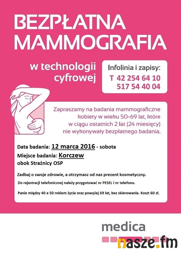 W najbliższą sobotę w godzinach 10.00-17.00 odbędą się bezpłatne badania mammograficzne przy strażnicy Ochotniczej Straży Pożarnej w Korczewie. Każda kobieta, która w tym dniu wykona badanie mammograficzne, otrzyma upominek kosmetyczny.