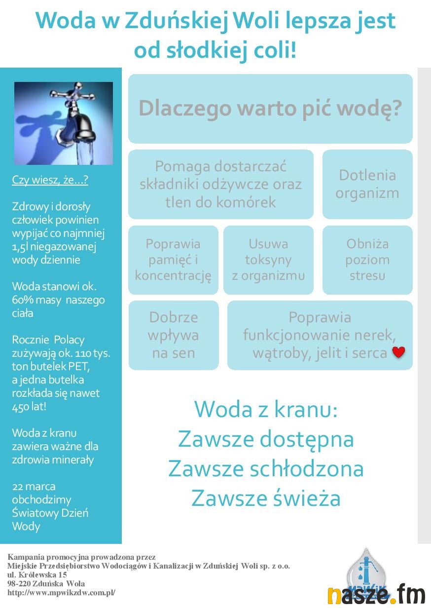Dziś w kalendarzu Światowy Dzień Wody. Z tej okazji Miejskie Przedsiębiorstwo Wodociągów i Kanalizacji w Zduńskiej Woli przygotowało specjalną kampanię. Ma ona na celu zachęcenie mieszkańców do picia wody z kranu, która jest najwyższej jakości.
