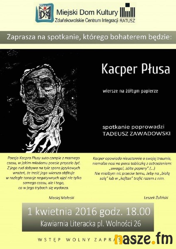 Kacper Płusa -młody, utalentowany i nagradzany poeta spotka się 1 kwietnia z miłośnikami poezji w Kawiarni Literackiej w Ratuszu. Okazją będzie promocja najnowszego, mocnego i gorąco przyjętego tomiku poezji „wiersze na żółtym papierze”.