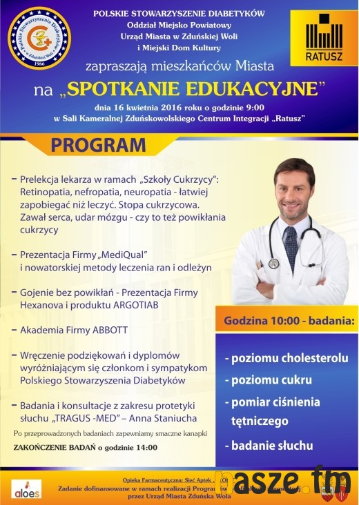 Głównym organizatorem wydarzenia jest zduńskowolski odział Stowarzyszenia Diabetyków. Tradycyjnie będzie można skorzystać z badań: cukru, słuchu, cholesterolu czy pomiaru ciśnienia tętniczego. Przewidziano też wykłady specjalistów, a także prezentacje firm farmaceutycznych. Początek o godz. 10:00. Wstęp wolny. Więcej szczegółów znajdziecie na plakacie poniżej.