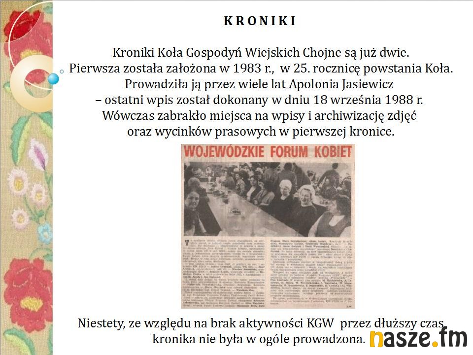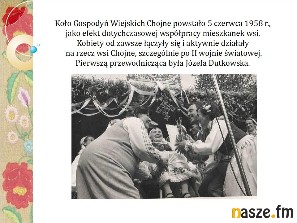 Rozmowy z paniami reprezentującymi KGW Chojne posłuchacie w odtwarzaczu po prawej stronie. W galerii znajdziecie prezentacje konkursową.