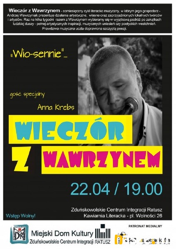 "Wio-sennie" taki tytuł nosi kolejna w tym roku, odsłona "Wieczoru z Wawrzynem", który już jutro odbędzie się w zduńskowolskim ratuszu. Wieczory to organizowane co drugi miesiąc spotkania literacko-muzyczne, których gospodarzem jest zduńskowolski muzyk Andrzej Wawrzyniak.