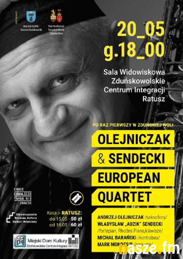 To będzie muzyczne wydarzenie maja. W Zduńskiej Woli wystąpi światowej sławy muzyk jazzowy, zduńskowolanin Andrzej Olejniczak. W Ratuszu wystąpi razem z "Adzikiem" Sendeckim, z którym tworzą Olejniczak&Sendecki European Quartet. Na scenie ratusza pojawią się także: Michał Barański i Mark Mondesir.