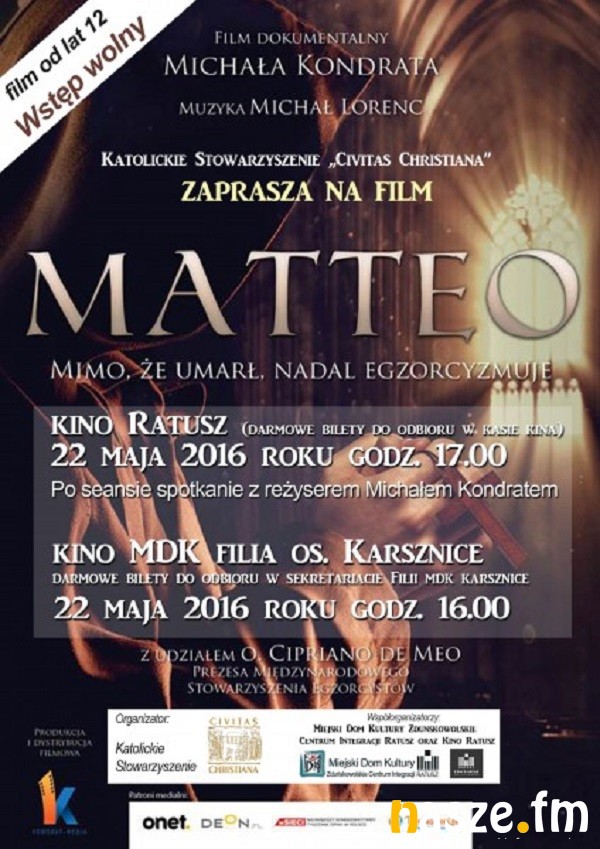Chrześcijańskie Stowarzyszenie Civitas Christiana w Zduńskiej Woli zaprasza w najbliższą niedzielę na projekcję głośnego filmu „Matteo”. Po filmie, w kinie Ratusz odbędzie się spotkanie z reżyserem Michałem Kondratem.