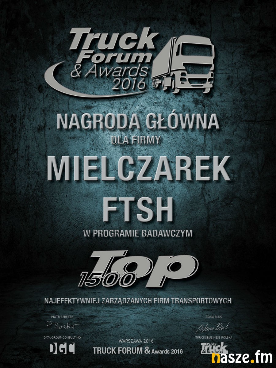 Podczas tegorocznego Truck Forum&Awards rozdane zostały nagrody dla laureatów rankingu Top 1500 Najefektywniej Zarządzane Firmy Transportowe. Nagrodę główną otrzymała zduńskowolska Firma Transportowo-Spedycyjno-Handlowa Mielczarek.
