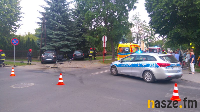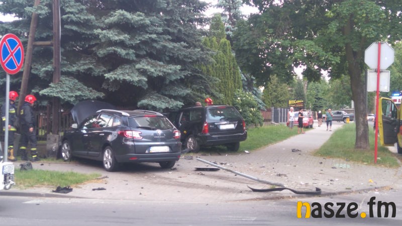 Według wstępnych ustaleń policji 41-letni kierowca Renault Megana, chcąc przeciąć ulicę Szkolną, wymusił pierwszeństwo przejazdu i doprowadził do zderzenia z prawidłowo jadącym Fordem Focusem. Samochody zjechały na chodnik, ścięły znak drogowy, po czym uderzyły w ogrodzenie posesji. Autami podróżowały cztery osoby, w tym dwoje dzieci.