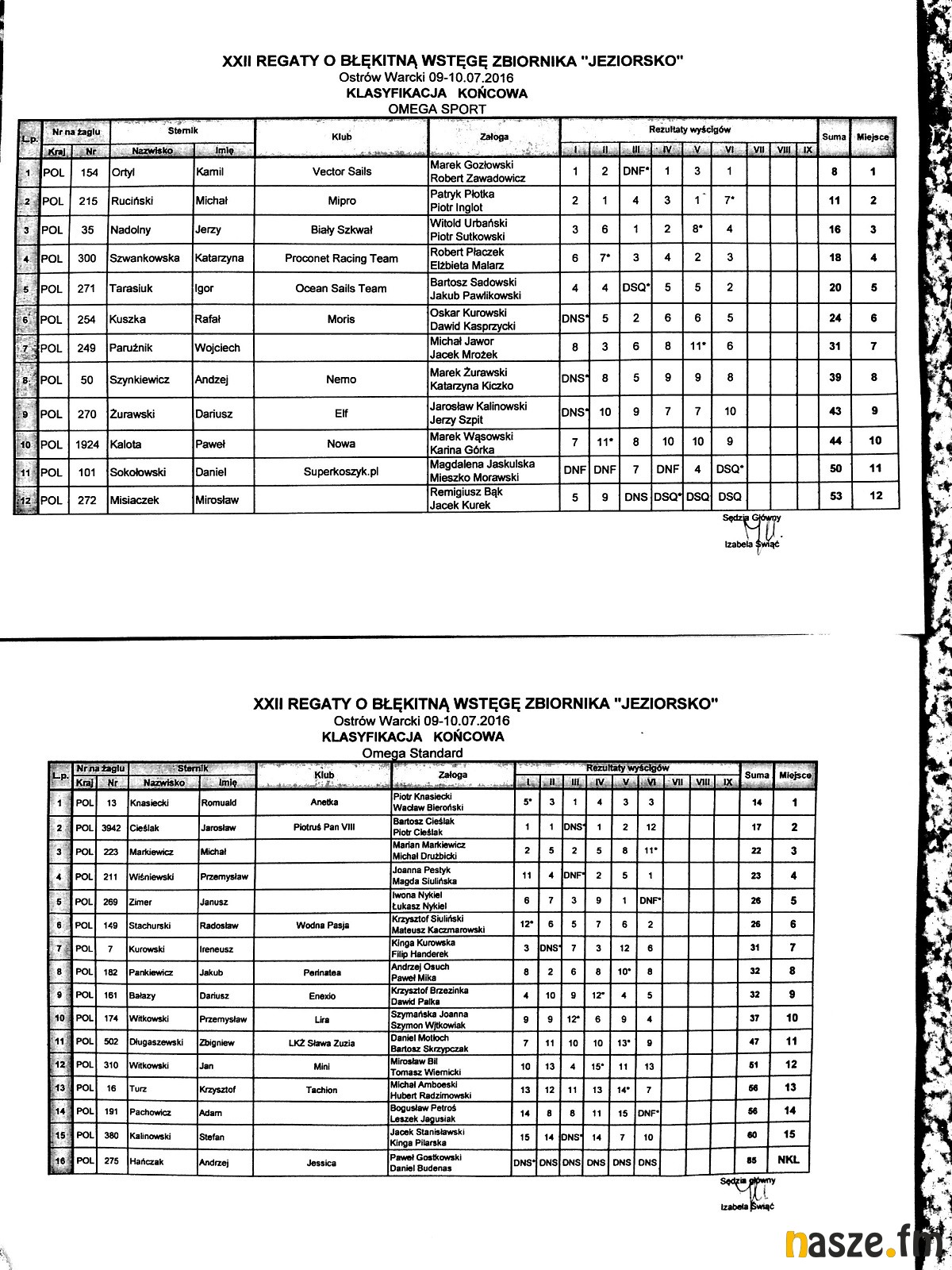 W tym roku zawody odbywały się dwutorowo. W swoich klasach rywalizowały łódki w ramach Regat o Błękitną Wstęgę, a oddzielnie ścigały się łodzie w klasie Omega w ramach Pucharu Polski. Jedni i drudzy mogli być zadowoleni z warunków pogodowych, choć nie obyło się bez wywrotek, czy defektów. Zdecydowanie mocniej wiało w sobotę, dziś Jeziorsko było już o wiele spokojniejsze. Wczoraj w trudnych warunkach rywalizowali uczestnicy przeprawy pływackiej miedzy brzegami zalewu. Zawodnicy płynęli pod wiatr, przy wysokiej fali, nic więc dziwnego, że nie wszyscy dotarli do mety. Kilka osób przegrało z aurą i do brzegu dotarło na pokładzie łodzi. Tym większe brawa należą się Natalii Krawczyk z Kalisza, która przepłynęła dystans niespełna 3 kilometrów najszybciej z całej stawki i jako jedyna złamała barierę 30 minut. Przed koncertami na scenie odbył się jubileuszowy konkurs Naszego Radia, a główną nagrodę (tablet) zdobył Maurycy z Sieradza, który na regaty przyjechał w charakterze zawodnika, natomiast naszej rozgłośni słucha od samego początku, czyli już 20 lat. Gratulujemy! Wczorajszy wieczór w marinie w Ostrowie Warckim to koncerty. Na scenie zaprezentowali się: Kapela z Warty, Dominika Żukowska i Andrzej Korycki, Klaudia Pawlak, Cliver. Pierwszy dzień regat zwieńczył pokaz laserowy.