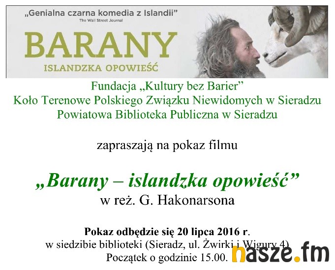 Fundacja "Kultury bez Barier", Koło Terenowe Polskiego Związku Niewidomych w Sieradzu i Powiatowa Biblioteka Publiczna w Sieradzu zapraszają na pokaz filmu "Barany - islandzka opowieść", który odbędzie się 20 lipca (środa) o godz 15:00 w bibliotece, ul. Żwirki i Wigury 4.