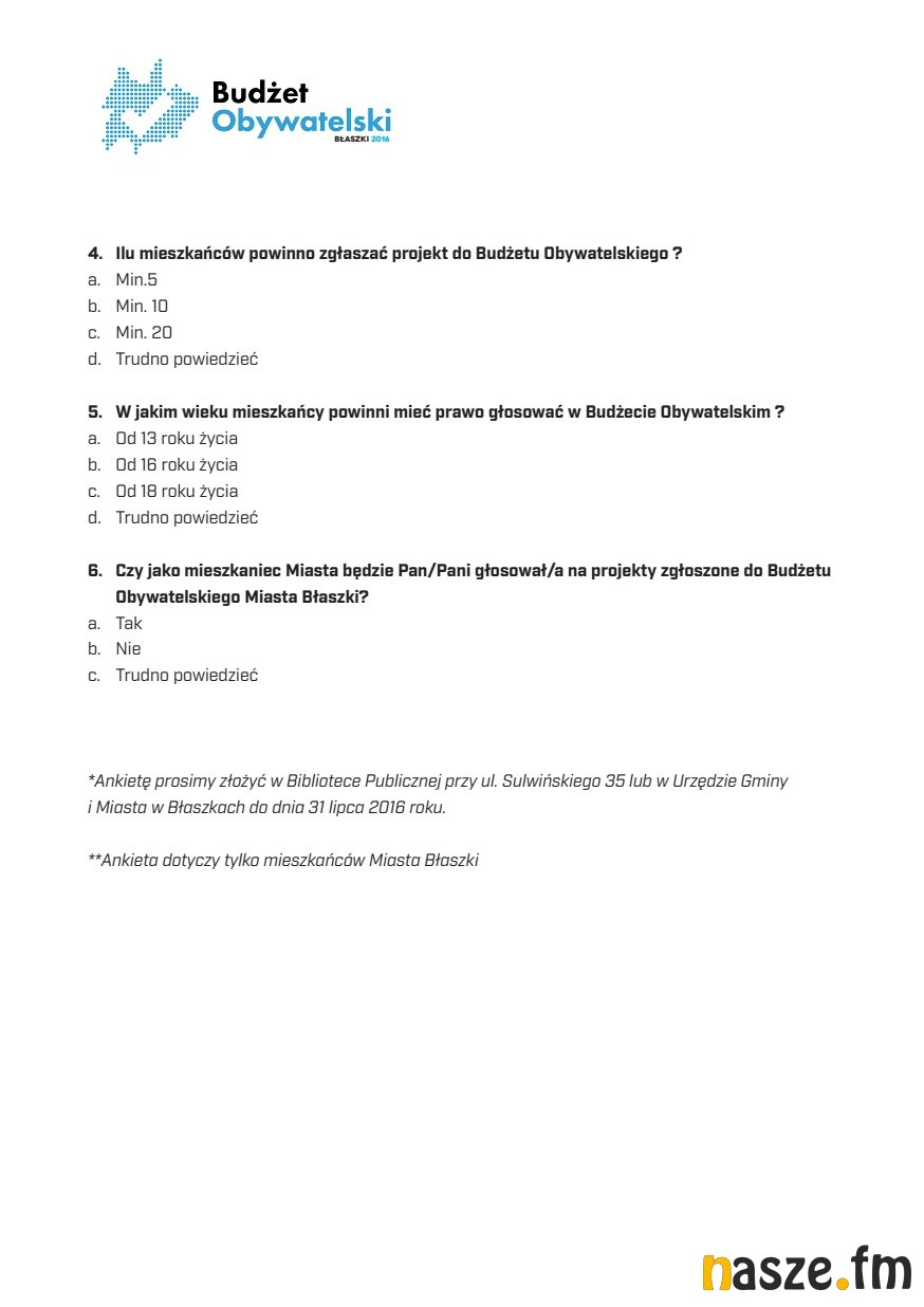 Na stronie internetowej Urzędu Gminy i Miasta oraz jako dodatek do Kuriera Błaszkowskiego pojawiła się ankieta dotycząca budżetu obywatelskiego. Ma ona na celu zebranie opinii mieszkańców na temat zasad funkcjonowania budżetu.