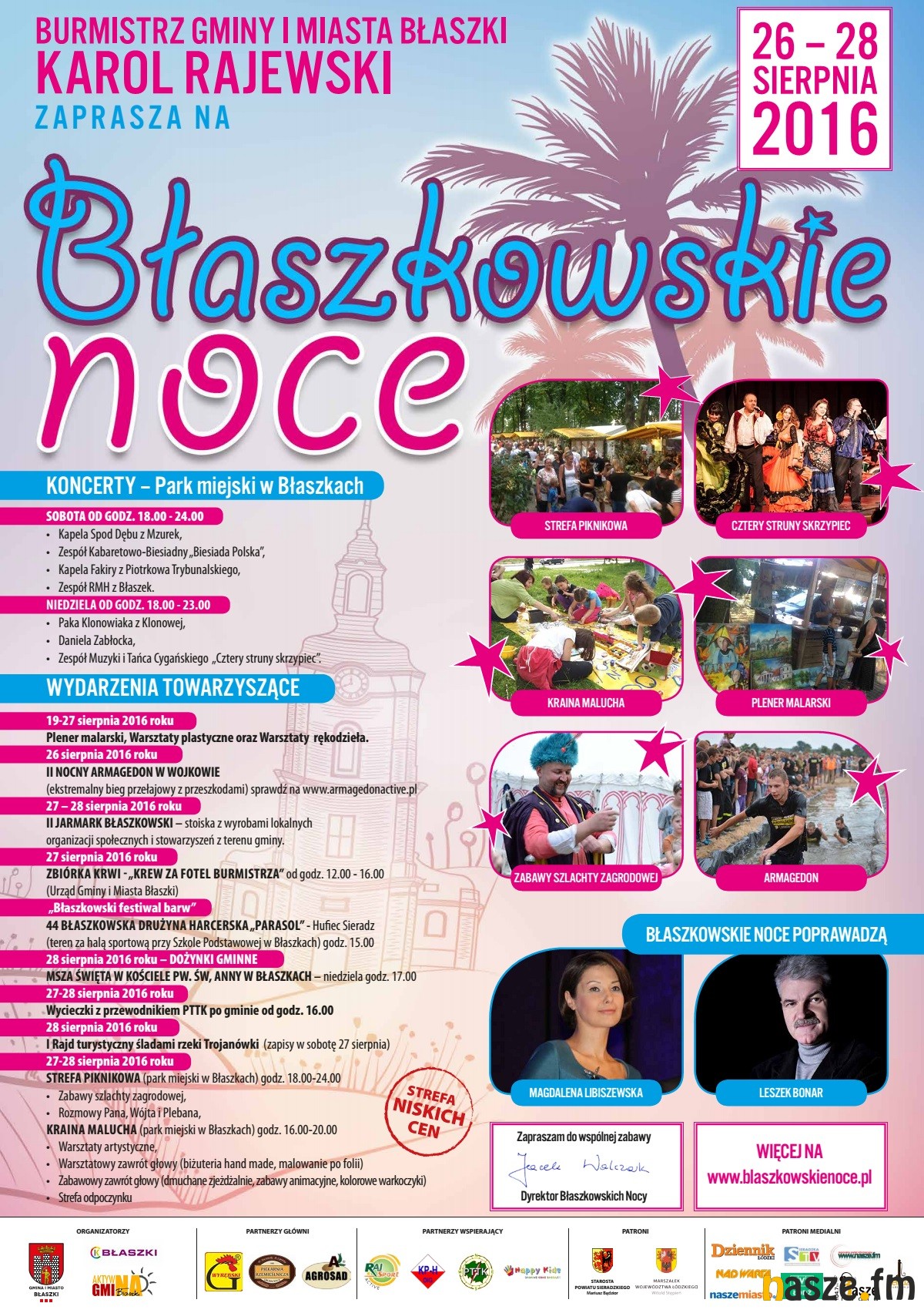 Podczas tegorocznego rodzinnego święta w Błaszkach na gości czekają: Kraina malucha, Nocny Armagedon, Jarmark Błaszkowski, wycieczki turystyczne, rajd turystyczny oraz Spotkania ze sztuką, ale przede wszystkim dobra zabawa, biesiadna muzyka i swojskie jadło. Błaszkowskie Noce łączą aktywność z wypoczynkiem!