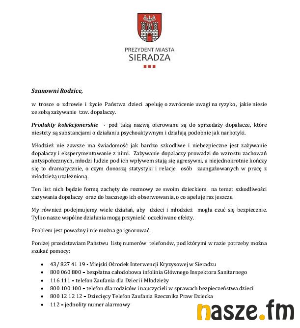 Prezydent Miasta Sieradza Paweł Osiewała skierował do rodziców list otwarty w sprawie dopalaczy. Pismo, które zostało przekazane na ręce dyrektorów szkół miało na celu poinformować rodziców o występującym problemie oraz instytucjach, które pomogą go rozwiązać w momencie wystąpienia.