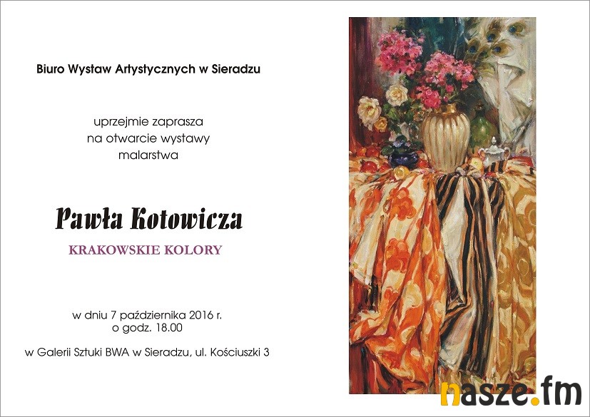 W najbliższy piątek ( 7 października ) w Biurze Wystaw Artystycznych w Sieradzu zostanie otwarta wystawa obrazów Pawła Kotowicza. Początek wernisażu o godz. 18:00. Wystawa jest zatytułowana "Krakowskie kolory".