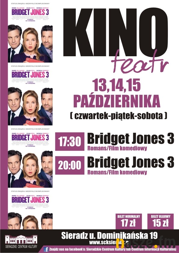 Na trzecią filmową część niekończących się miłosnych zawirowań w życiu Bridget Jones fani na całym świecie czekali lata. Ten film będzie można obejrzeć w Teatrze Miejskim w Sieradzu w tym tygodniu. Seanse zaplanowano na 13,14 i 15 października.