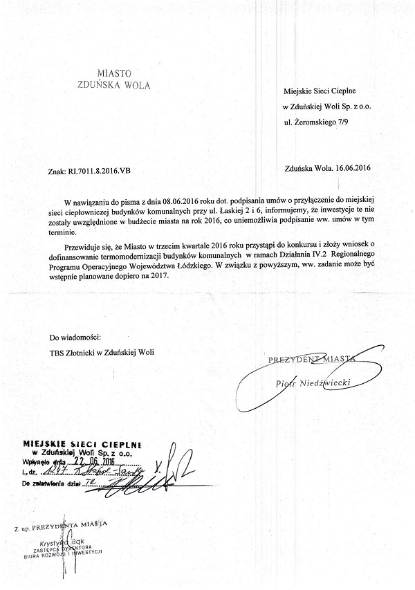 W związku z opublikowaniem wypowiedzi Prezydenta Zduńskiej Woli Pana Piotra Niedźwieckiego, w której Pan Prezydent wskazuje jakoby po mojej stronie leżała przyczyna braku realizacji przyłączy do budynków przy ul. Łaskiej 2 i 6 informuję, że rzeczywistym powodem była odmowa Pana Prezydenta odnośnie podpisania umów o przyłączenie tych budynków do miejskiej sieci cieplnej.