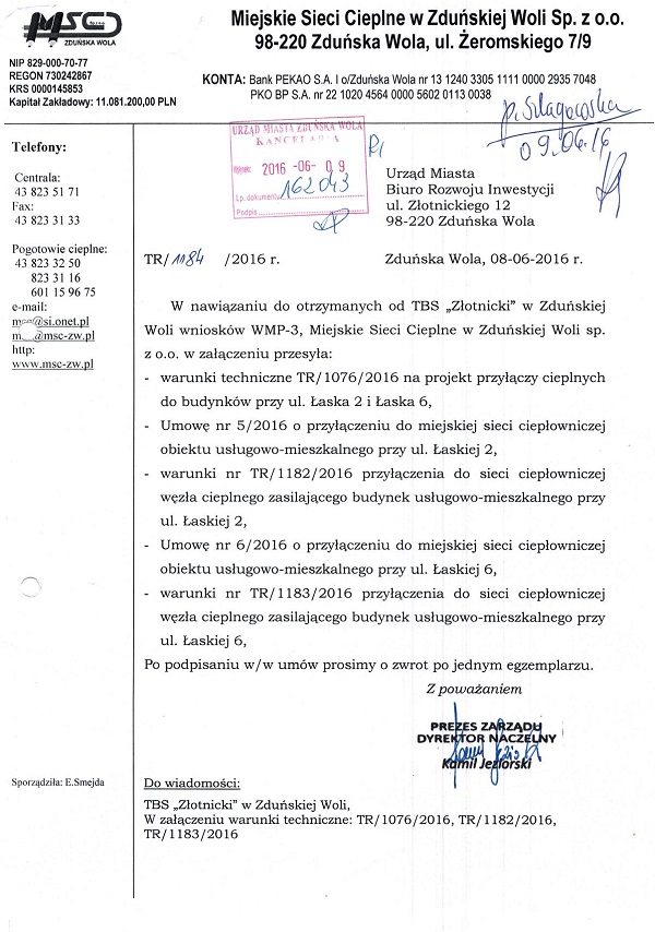 W imieniu MSC w Zduńskiej Woli sp. z o.o. wnioskowałem o przyłączenie, jednak Pan Prezydent poinformował mnie, że zadanie to może być wstępnie planowane dopiero na rok 2017.