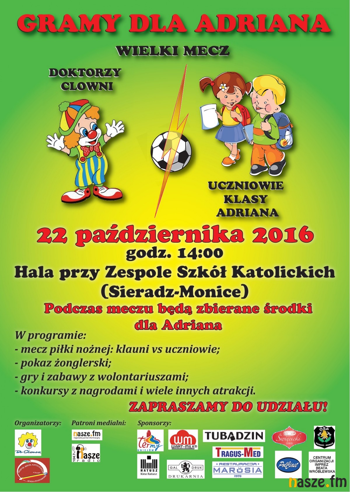 Sieradzki oddział Fundacji "Dr Clown" zaprasza na mecz charytatywny dla ciężko chorego 11 - letniego Adriana. Jest to wspólna inicjatywa fundacji z Zespołem Szkół Katolickich, którego Adrian jest uczniem.