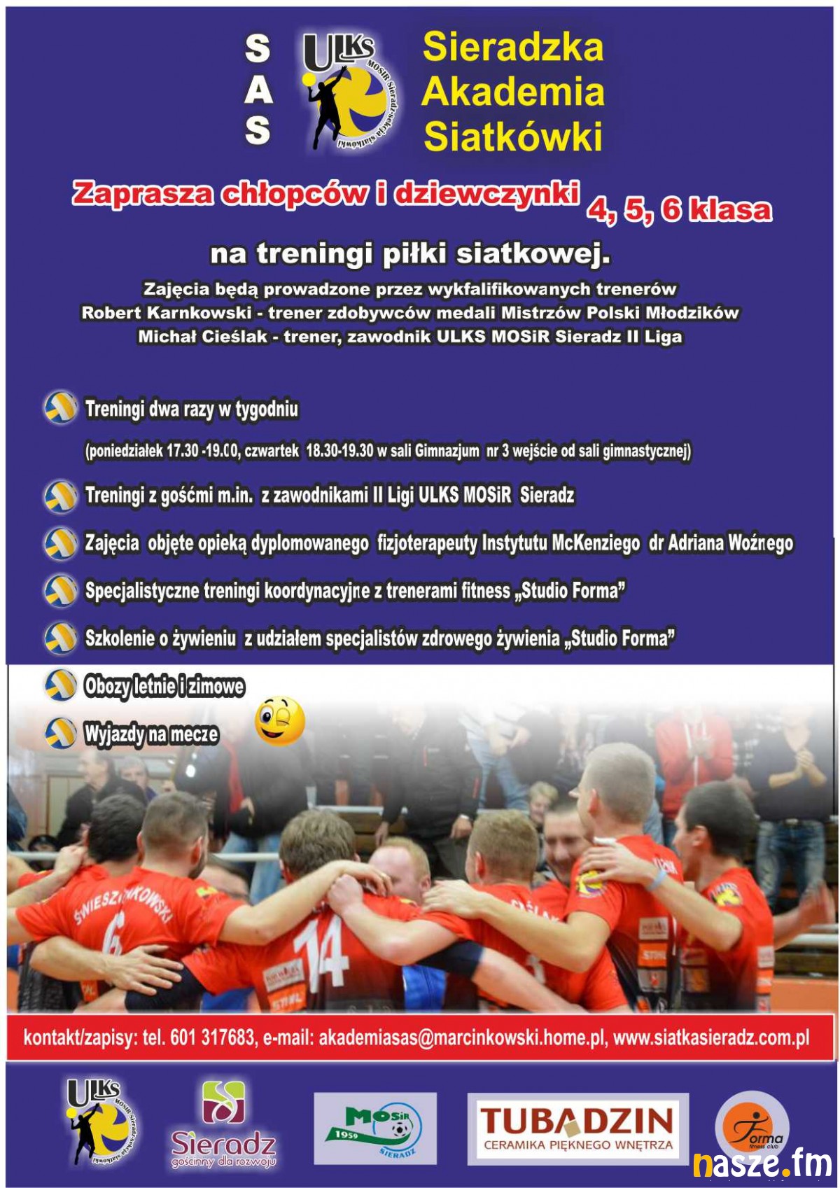 Oferta klubu skierowana jest do dzieci ze szkół podstawowych, praktycznie w każdym wieku, zarówno dziewczynek, jak i chłopców. - Po pierwszych zajęciach zobaczymy, jakie będzie zainteresowanie i dokonamy ewentualnego podziału na grupy wiekowe - mówi wiceprezes ULKS MOSiR ds. siatkówki Witold Marcinkowski. Zajęcia będą się odbywać w hali Gimnazjum nr 3 w Sieradzu w czwartki (18:30) i poniedziałki (17:30). Treningi poprowadzą: Robert Karnkowski (trener medalistów Mistrzostw Polski Młodzików) oraz Michał Cieślak (zawodnik II ligowego zespołu ULKS MOSiR). Nad młodymi siatkarzami będzie także czuwał dyplomowany fizjoterapeuta dr Adrian Woźny. Grupa będzie też uczestniczyć w zajęciach fitness oraz odbędzie szkolenia w zakresie zdrowego żywienia. W planach są oczywiście obozy sportowe i udział w turniejach.