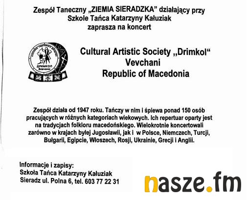 Zespół Taneczny "Ziemia Sieradzka" działający przy Szkole Tańca Katarzyny Kałuziak zaprasza na koncert Cultural Artistic Society "Drimkol" Vevchani Republic of Macedonia. To wydarzenie już 26 października w Sieradzu.