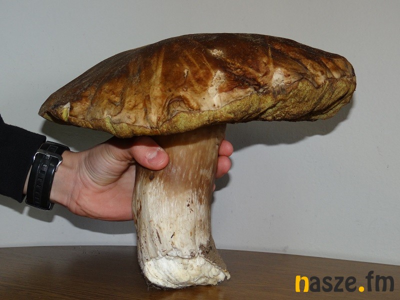 Grzyb waży 1,5 kilograma a średnica jego kapelusza to 32 cm. Prawdziwek jest zdrowy i rósł obok samotnego drzewa na Wartą w Strońsku na terenie Parku Krajobrazowego Międzyrzecza Warty i Widawki.
