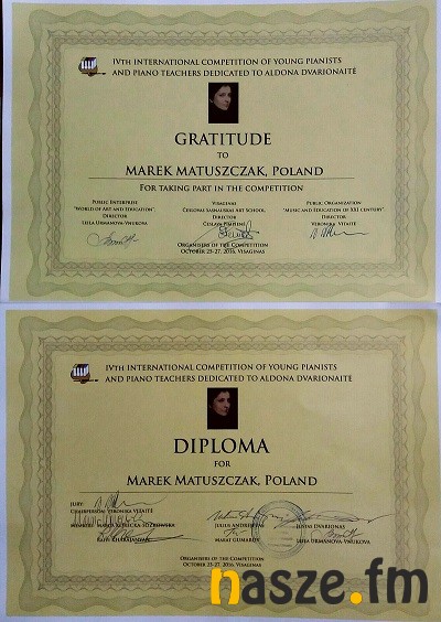 Konkurs dedykowany Aldonie Dvarionaite w Visaginas został przeprowadzony w dniach 25 - 27 października. To kolejny sukces zdolnego pedagoga. Wiosną tego roku Marek Matuszczak zdobył III miejsce na IV International Master Competition for Music Teachers, a w roku 2015 został laureatem I nagrody na XV Międzynarodowym Konkursie - Festiwalu MUSIC WITHOUT LIMITS w Druskiennikach na Litwie.Gratulujemy i życzymy dalszych sukcesów.