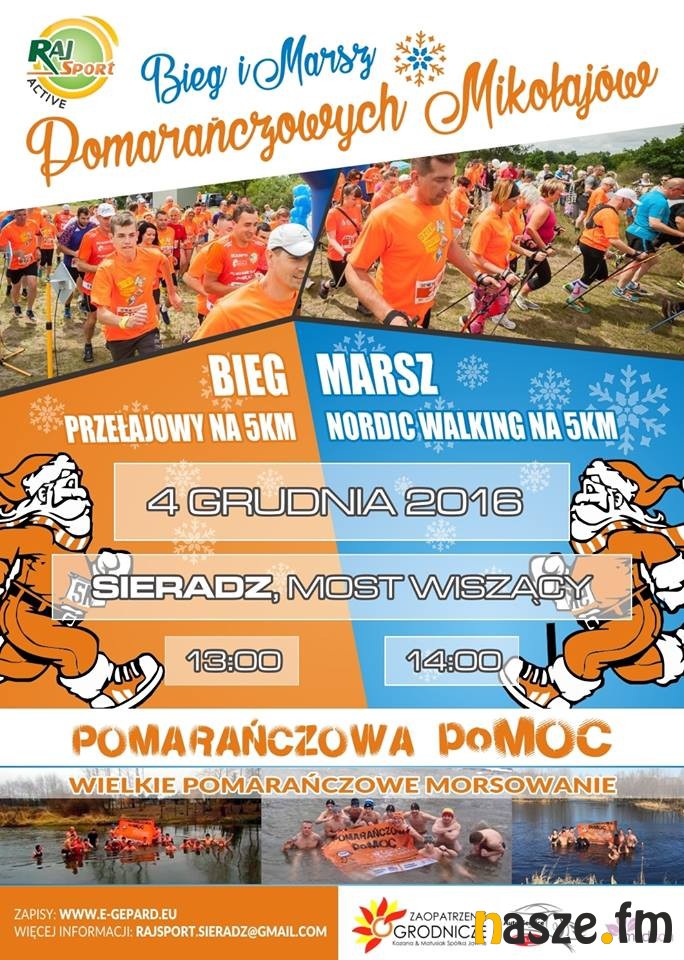Impreza będzie bardzo zbliżona do tej, która odbyła się nad rzeką w Sieradzu latem. Będzie marsz i bieg na dystansie 5 km, a ponieważ odbędzie się on na początku grudnia, mile widziany będzie strój Mikołaja. Ponieważ Mikołaj kojarzy się z prezentami, uczestnicy biegu i marszu również będą mogli wczuć się w rolę i uszczęśliwić dzieciaki. Imprezę organizuje klub Raj Sport Active, który prowadzi również akcję Pomarańczowej Pomocy. Jeśli ktoś chciałby spróbować mocniejszych wrażeń, trzecią formą aktywności przygotowaną na zimowy dzień sportu jest wspólna kąpiel.