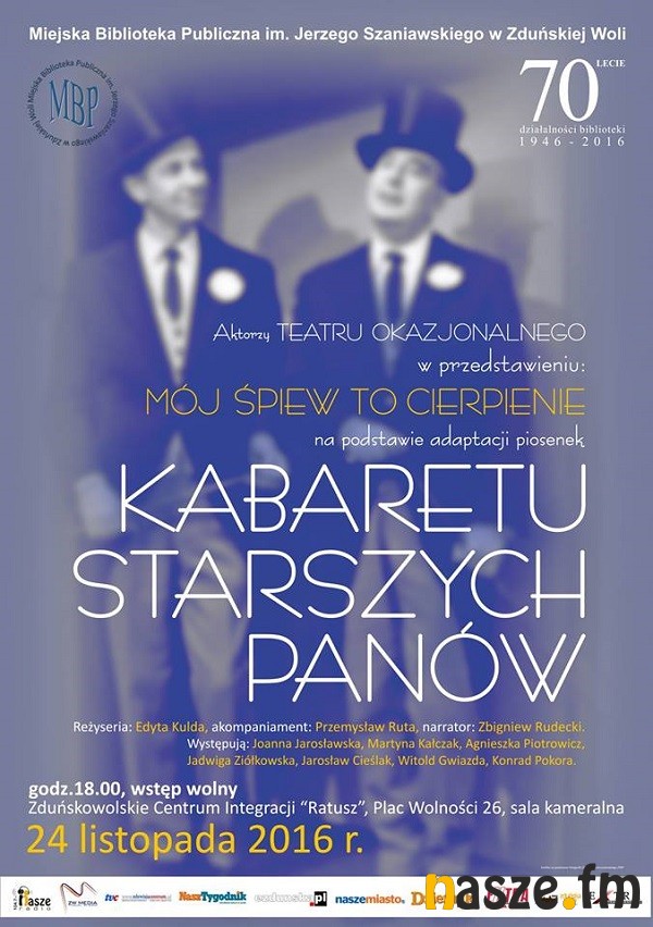 Podczas spektaklu będzie można usłyszeć adaptacje utworów Jeremiego Przybory i Jerzego Wasowskiego, twórców Kabaretu Starszych Panów, w interpretacji zduńskowolskich samorządowców, dziennikarzy, pedagogów i animatorów kultury. Piosenki "Tanie dranie", "Piosenka jest dobra na wszystko" czy "Kaziu, zakochaj się" wciąż żyją w świadomości słuchaczy. Wykonanie ich na nowo, ale w tym samym duchu, z pewnością zaczaruje tych odbiorców którzy nadal pamiętają Starszych Panów oraz tych, którzy nie mieli okazji ich oglądać.