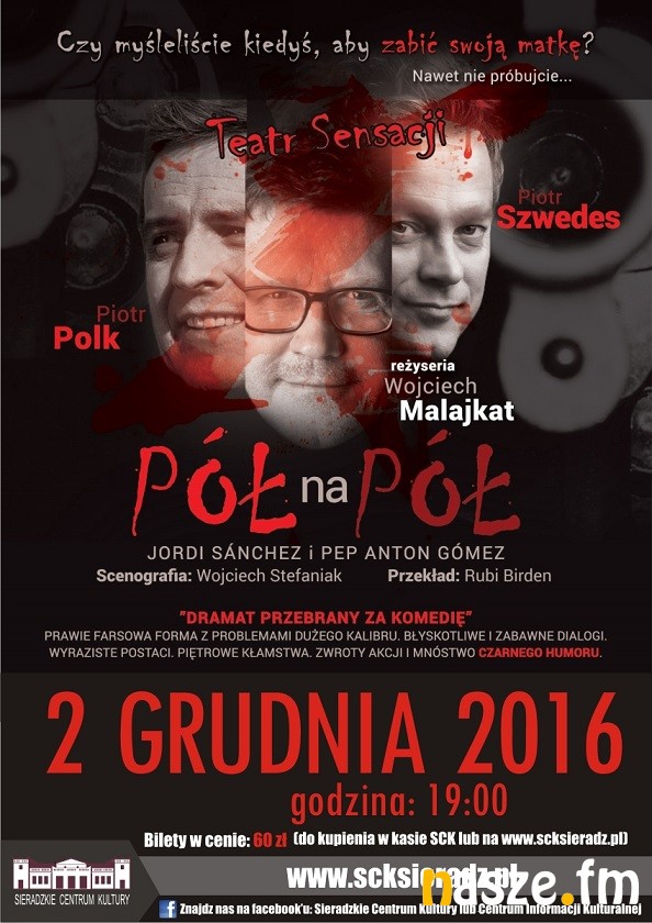 W piątek 2 grudnia w Teatrze Miejskim w Sieradzu zostanie wystawiony spektakl "Pół na pół". Czego mogą spodziewać się widzowie? Świetnie napisanych, błyskotliwych i zabawnych dialogów oraz wyraziście nakreślonych postaci. Piętrowe kłamstwa, zwroty akcji i mnóstwo humoru.... A na scenie dwóch popularnych aktorów: Piotr Polk i Piotr Szwedes.