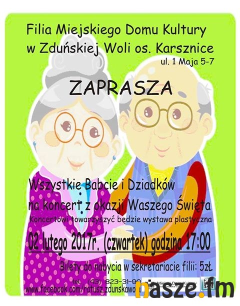 Koncert dla Babć i Dziadków zaplanowano również w filii Miejskiego Domu Kultury w Karsznicach. Tutaj zespoły i soliści zaprezentują się 2 lutego o godz. 17. Bilety w cenie 5 zł. są do nabycia w sekretariacie filii.