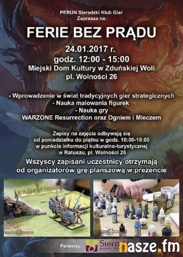 Ferie bez prądu, to projekt który ma zapewnić dzieciom i młodzieży atrakcje związane z grami planszowymi, grami bitewnymi, grami tradycyjnymi. Nie zabraknie również tematyki filmowej oraz literatury związanej z fantastyką.