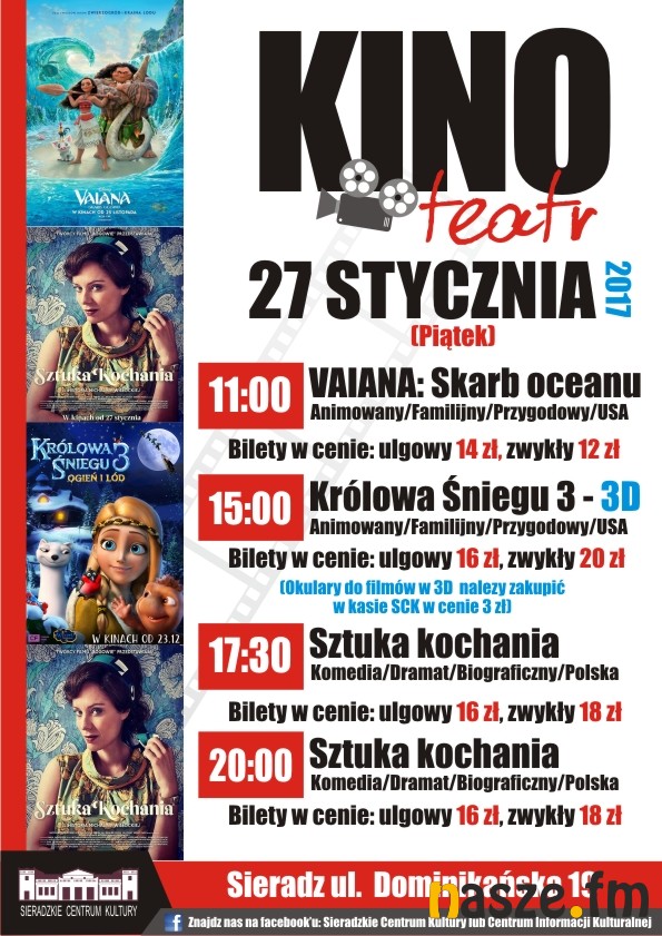 W Kinie Teatr w Sieradzu w tym tygodniu możecie obejrzeć dwie produkcje animowane: Vaiana: Skarb oceanu oraz Królowa Śniegu 3: Ogień i lód. To ostatni moment,żeby zobaczyć film Po prostu przyjaźń.Natomiast od najbliższego piątku wyświetlany będzie film: Sztuka kochania. Historia Michaliny Wisłockiej.