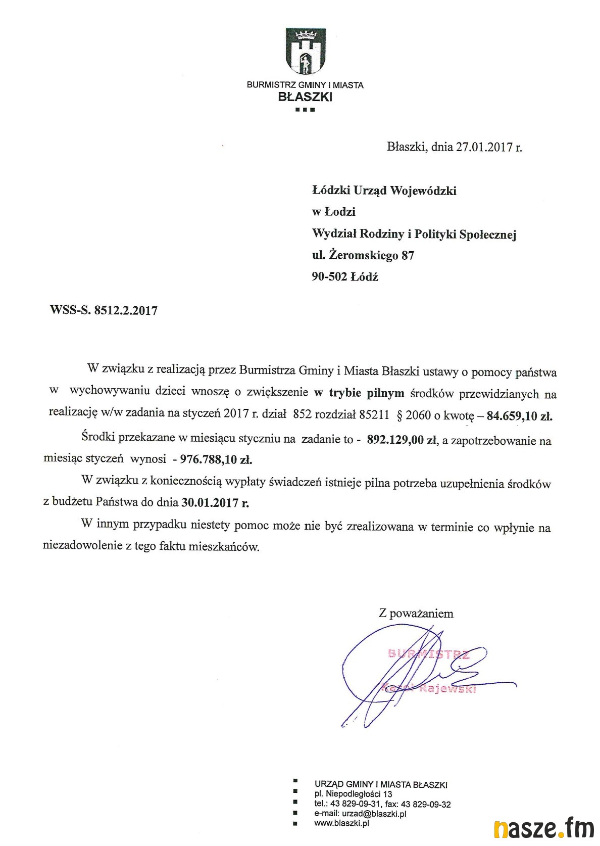 "Burmistrz Gminy i Miasta Błaszki przeprasza za mogące wystąpić opóźnienia w wypłacie świadczeń wychowawczych w ramach Programu „Rodzina 500+” za miesiąc styczeń z powodu braku wystarczającej ilości środków na w/w zadanie. Do dnia dzisiejszego tj. 27.01.2017 r. nie otrzymaliśmy kwoty 84 659,10 zł. W związku z powyższym Burmistrz podjął natychmiastową interwencję w Łódzkim Urzędzie Wojewódzkim o pilne uzupełnienie brakujących środków."
