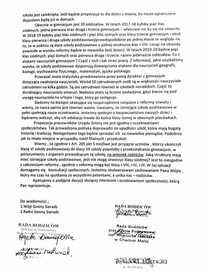 Okazuje się, że przedstawiciele rad rodziców mają też żal, że Rada Gminy Sieradz unika problemu, a radni nie wzięli przykładu z Urzędu Miasta Sieradza i nie zorganizowali żadnych konsultacji społecznych w tej sprawie. Rodzice nadal nie otrzymali żadnej odpowiedzi pisemnej w sprawie petycji, którą złożyli na jednej z sesji Rady Gminy Sieradz. Jutro rodzice pojawią się na wspomnianym spotkaniu. Maja nadzieje,że uda im się przedstawić ich stanowisko w sprawie nowego pomysłu. Poniżej możecie przeczytać treść pisma, które rodzice będą próbowali złożyć: