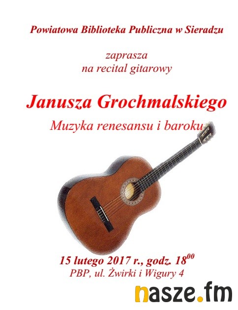 Powiatowa Biblioteka Publiczna w Sieradzu zaprasza jutro (środa 15 lutego) na recital gitarowy Janusza Grochmalskiego "Muzyka renesansu i baroku". Początek o godz. 18:00, wstęp wolny.