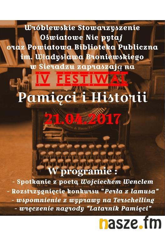 21 kwietnia w Powiatowej Bibliotece Publicznej w Sieradzu odbędzie się kolejny Festiwal Pamięci i Historii. Organizatorem tegorocznej edycji jest Wróblewskie Stowarzyszenie Oświatowe „Nie pytaj”. Tego dnia rozstrzygnięty zostanie konkurs literacki „ Perła z Lamusa”.
