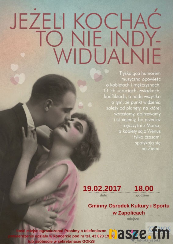 - Będzie to muzyczna opowieść o kobietach, mężczyznach, uczuciach związkach, konfliktach i o tym, że na pewne sprawy mamy różny punkt widzenia. Wszystko oczywiście okraszone doskonałą piosenką i humorem. Usłyszymy m.in. utwory Kabaretu Starszych Panów, hity z okresu międzywojennego i powojennego. Nie zabraknie też "Brunetek i blondynek" czy tytułowego "Jeżeli kochać to nie indywidualnie" - zaznacza Paweł Perdek, dyrektor zapolickiego GOKiS-u.