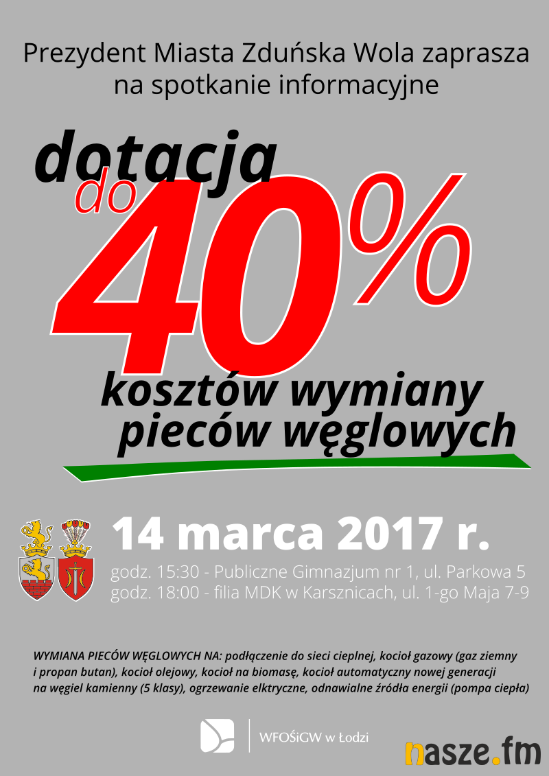 Zduńskowolski Urząd Miasta zachęca mieszkańców do wymiany pieców węglowych na ekologiczne źródła ciepła. W magistracie można składać deklaracje do programu Wojewódzkiego Funduszu Ochrony Środowiska i Gospodarki Wodnej w Łodzi, w ramach którego na ten cel można otrzymać dotację, która pokryje nawet 40 proc. kosztów.