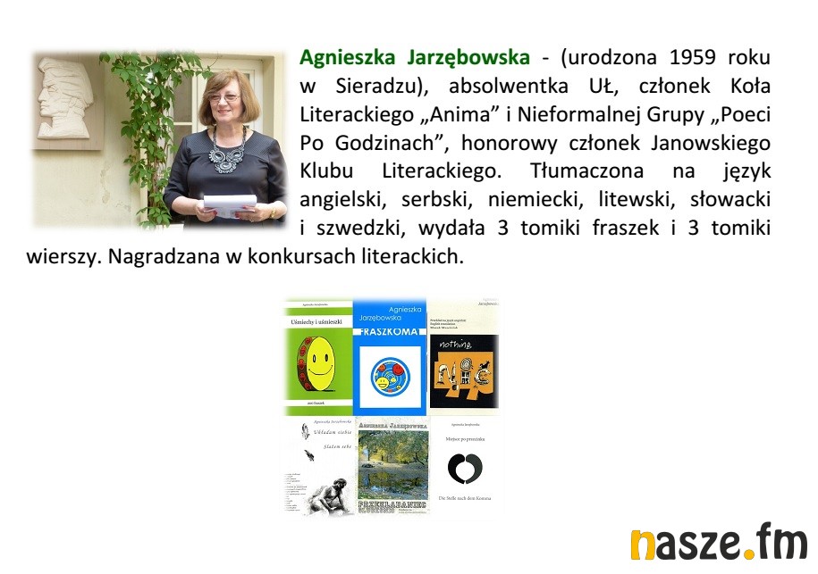 Powiatowa Biblioteka Publiczna w Sieradzu (ul. Żwirki i Wigury 4) zaprasza na spotkanie z Agnieszką Jarzębowską. Poetka dziś (środa 29 marca) opowie o swoich podróżach do Wielkiej Brytanii i na Litwę . Początek o godz. 18:00. Z kolei po godz. 15 będzie gościem Naszego Radia.
