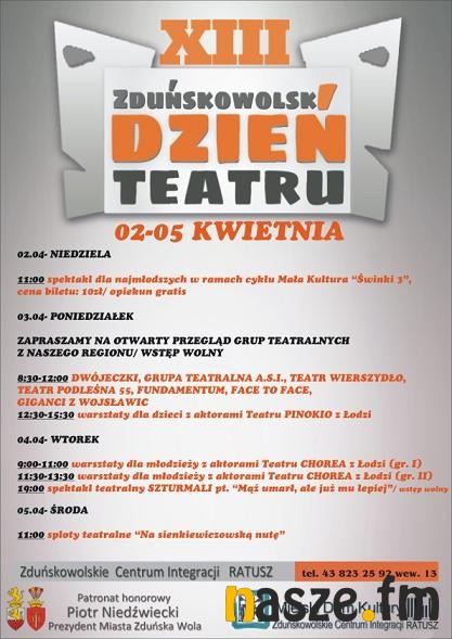 W Zduńskowolskim Centrum Integracji Ratusz Dzień Teatru obchodzony będzie od 2 kwietnia i rozpocznie się spektaklem dla najmłodszych "Świnki 3". 3 kwietnia o godz. 9:00 rozpocznie się otwarty przegląd grup teatralnych. Natomiast we wtorek 4 kwietnia o godz. 19:00 można będzie zobaczyć spektakl grupy Szturmali pt. "Mąż umarł, ale już mu lepiej".