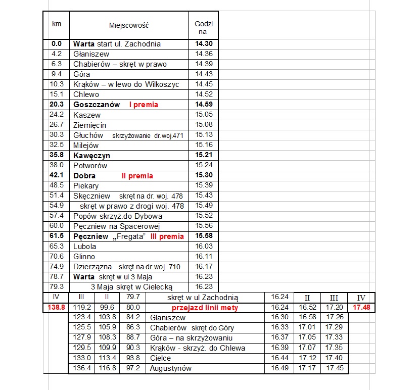 I etap/piątek 31 marca/wyścig ze startu wspólnego/dystans 139 km trasa: Warta - Chabierów - Chlewo - Goszczanów (I premia) - Głuchów - Kawęczyn - Dobra (II premia) - Piekary - Skęczniew - Siedlątków - Popów - Pęczniew (III premia) - Lubola - Glinno - Dzierzązna - Warta - trzy rundy Warta - Chabierów - Góra - Krąków - Cielce - Warta (premia specjalna na pierwszym wjeździe na rundę) start godz. 14.30, meta ok. godz. 18.00 w Warcie, ul. Zachodnia