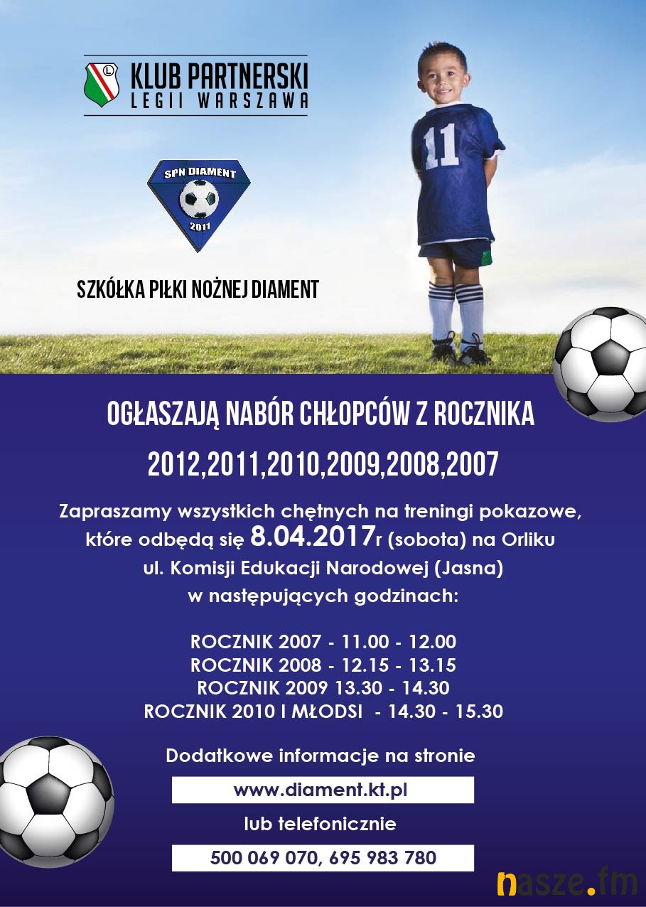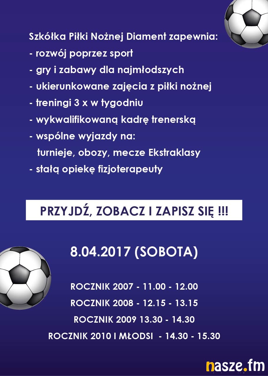Szkółka Piłki Nożnej DIAMENT ogłasza nowe nabory do wszystkich roczników. Zapraszamy na treningi pokazowe każdego rocznika w dniu 8 kwietnia - sobota - orlik przy ul. Jasnej. Wejdź i zobacz szczegóły.