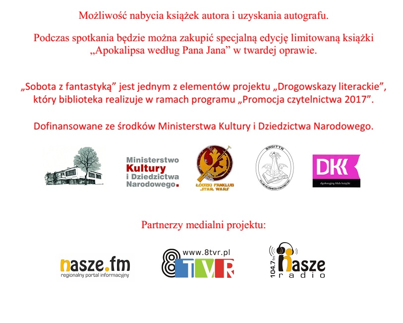 Do udziału w wydarzeniu zapraszają: Powiatowa Biblioteka Publiczna w Sieradzu, Dyskusyjny Klub Książki - Klub Miłośników Fantastyki "Sagitta"