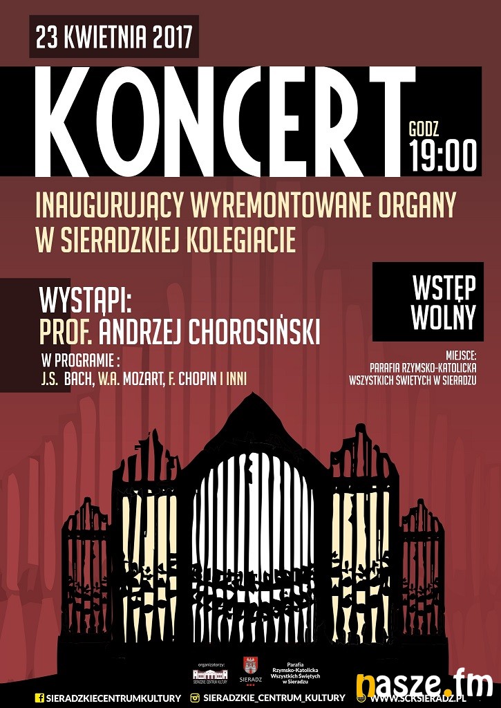 W kościele Parafii Rzymsko-Katolickiej Wszystkich Świętych w Sieradzu ( ul. Kolegiacka 11) wystąpi prof. Andrzej Chorosiński. Wykona kompozycje J.S. Bacha, W.A. Mozarta czy F. Chopina. Początek koncertu o godz. 19:00, wstęp wolny.