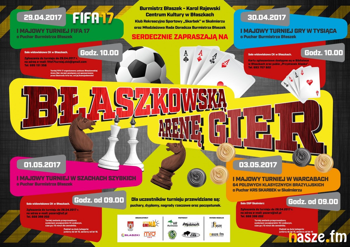 Burmistrz Błaszek-Karol Rajewski, Centrum Kultury w Błaszkach, Klub Rekreacyjno-Sportowy „Skarbek” w Skalmierzu oraz Młodzieżowa Rada Doradcza Burmistrza Błaszek serdecznie zapraszają na „Błaszkowską Arenę Gier”.