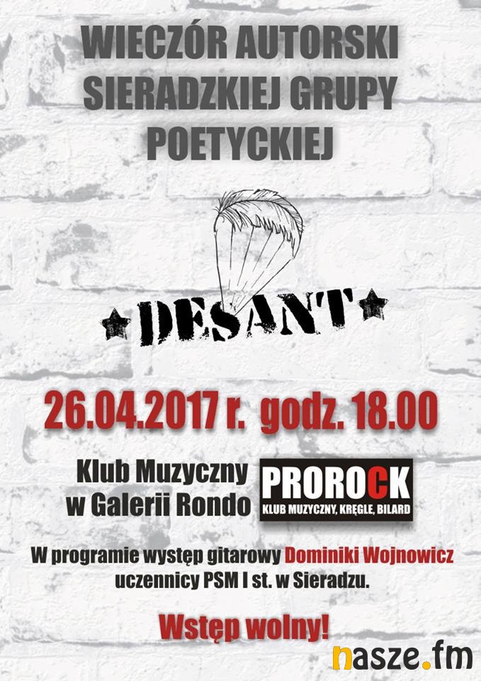 Grupa "Desant" istnieje już od prawie czterech lat, spotyka się regularnie w Centrum Informacji Kulturalnej i liczy około 10 członków. Wśród nich są zarówno doświadczeni twórcy z wieloma wydanymi tomikami, często nagradzani oraz jurorujący w innych konkursach literackich jak i początkujący poeci. Każdy z nich prezentuje własny styl i inną wrażliwość twórczą, na co dzień wykonując zawód często nie związany z poezją. Łączy ich jednak wspólna pasja i przyjaźń oraz chęć promowania twórczości literackiej w Sieradzu i poza jego granicami. Grupa ma na swoim koncie wiele zorganizowanych imprez (między innymi Noc Poezji i Muzyki w Sieradzu czy Mikołajki Poetyckie), jak i wieczorów autorskich oraz warsztatów. Biorą udział w różnych festiwalach i zlotach poetyckich w całej Polsce. W ProRocku zaprezentują swoje najnowsze utwory, będzie można także kupić tomiki z autografami. Wieczór uświetni swoim występem Dominika Wojnowicz, utalentowana uczennica Państwowej Szkoły Muzycznej I st. w Sieradzu.