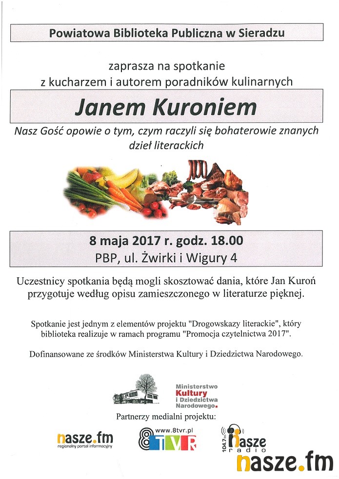 Powiatowa Biblioteka Publiczna w Sieradzu zaprasza dziś (poniedziałek 8 maja) na spotkanie z kucharzem i autorem poradników kulinarnych. Jan Kuroń opowie o tym, czym raczyli się bohaterowie znanych dzieł literackich. Początek o godz. 18:00.