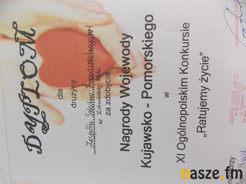 Drużyna reprezentująca szkołę, składała się z 3 osób, a byli to: Ania Drozd kl. Vb, Gabrysia Zwierzchowska kl. VIb i Franek Opaliński kl. Vb. Młodzi ratownicy debiutowali w tym konkursie, pomimo dużego stresu spisali się znakomicie, za co zostali wyróżnieni i otrzymali nagrodę Wojewody Kujawsko - Pomorskiego.