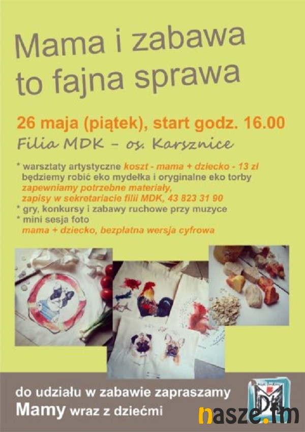 "Mama i zabawa to fajna sprawa" to propozycja na spędzenie miłego popołudnia. W programie przewidziano m.in: warsztaty artystyczne, podczas których będzie można zrobić torby i mydła ekologiczne.