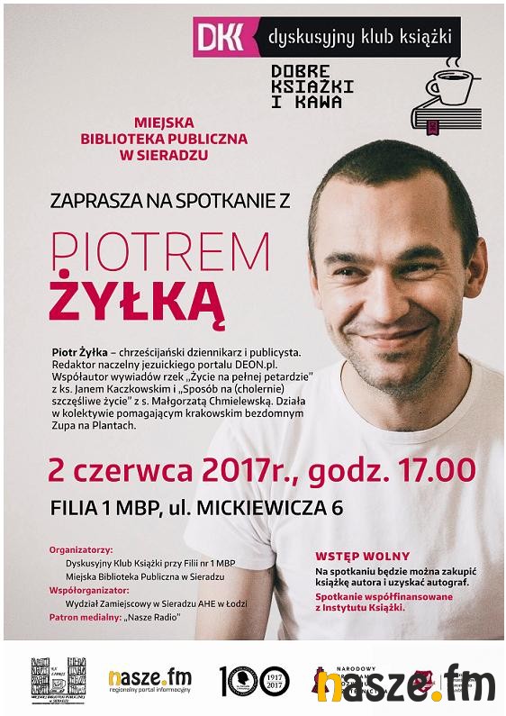 - Piotr Żyłka, jest dziennikarzem i publicystą. Stworzył i prowadzi projekt faceBóg oraz polski profil papieża Franciszka, ale chyba najbardziej jest znany z wywiadów, które ukazały się w formie książek. Pierwszą z nich jest wydana w 2015 roku publikacja zatytułowana" Życie na pełnej petardzie", gdzie Piotr Żyłka rozmawia z księdzem Janem Kaczkowskim, Rok później ukazała się książka "Sposób na cholernie szczęśliwe życie", w której znajdziecie rozmowę z siostrą Małgorzatą Chmielewską. Spotkanie organizowane jest w ramach projektu dyskusyjnych klubów książki. Podczas tego wydarzenia będzie można zakupić wspomniane książki i uzyskać autograf od Piotra Żyłki - mówi Katarzyna Pietrych z Miejskiej Biblioteki Publicznej w Sieradzu.