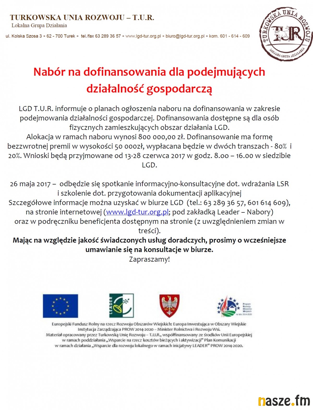 Lokalna Grupa Działania Turkowska Unia Rozwoju informuje o planach ogłoszenia naboru na dofinansowania w zakresie podejmowania działalności gospodarczej.